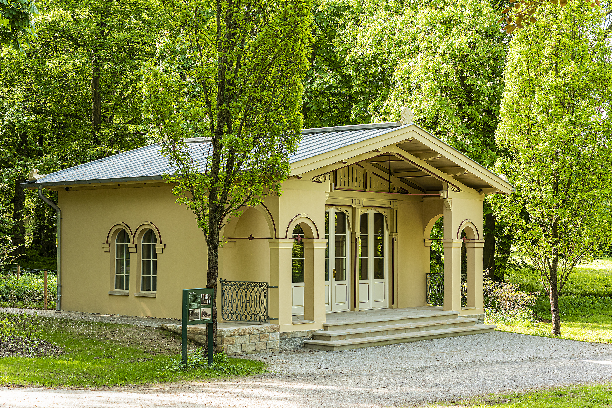 Ebenso dezent und funktional wurde im Außenbereich die notwendige barrierefreie Erschließung über eine seitliche Öffnung ermöglicht. Der Eingangsbereich mit der großzügigen Sandsteinstufenanlage konnte hierdurch erhalten bleiben und prägt die aufwändig gestaltete Hauptansicht des Teehauses.